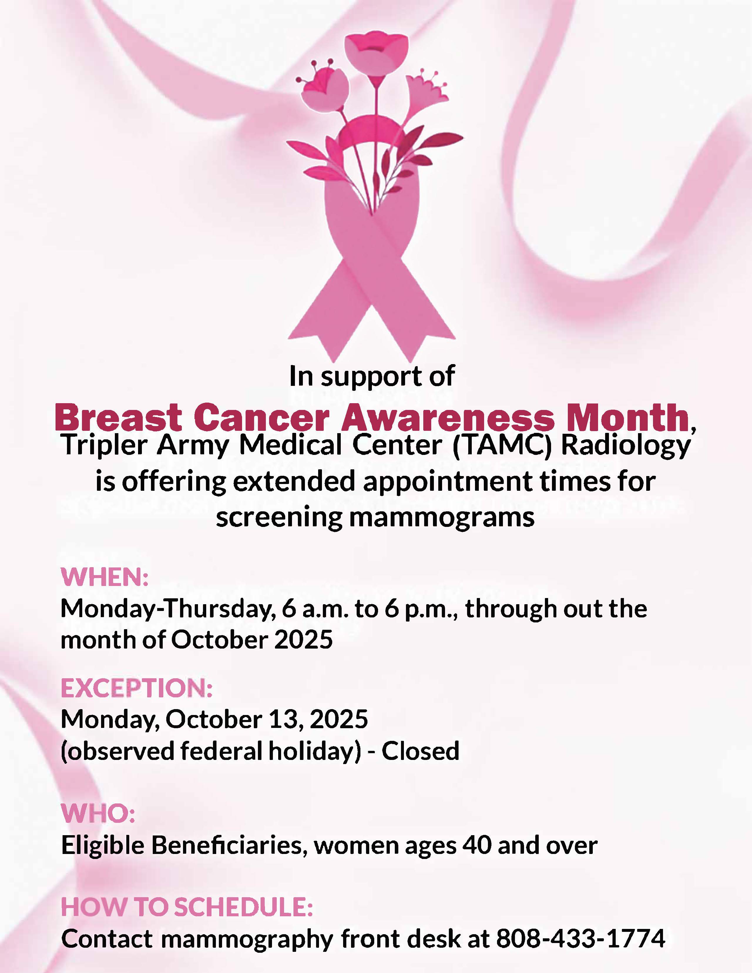 Jarrett White Rd. Sewer replacement - Starting 25 August 2025 - 28 February 2026 Tripler traffic flow change - Starting July 25, 2025 TAMC Radiology is offering extended appointment times for screening mammograms Tripler Army Medical Center Social Media Facebook: Tripler Army Medical Center Instagram: Tripler Army Medical Center
