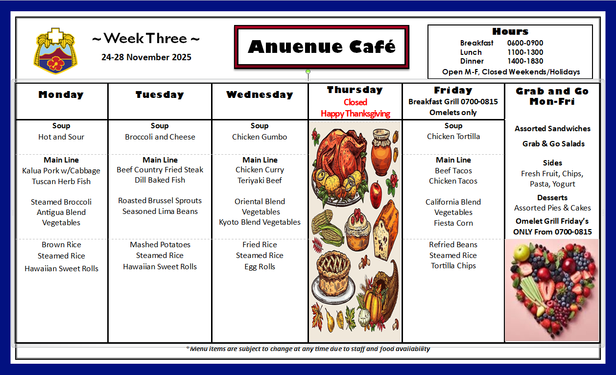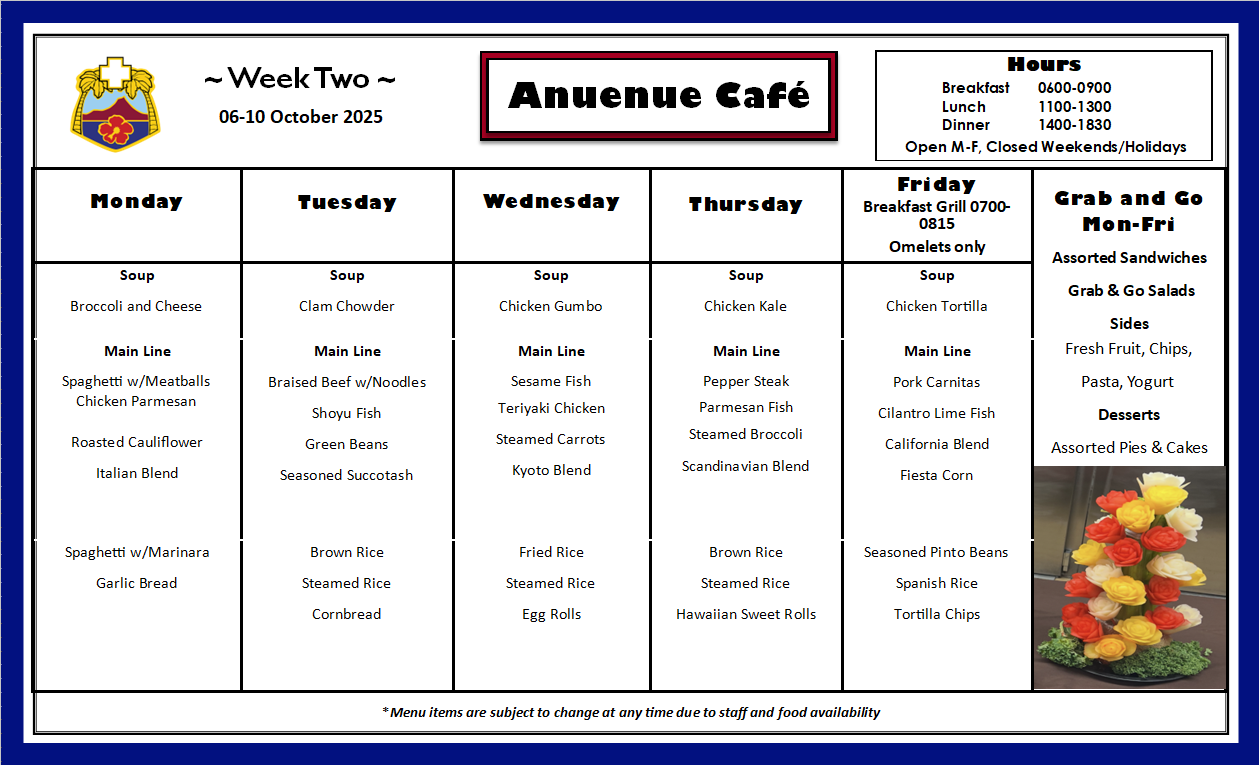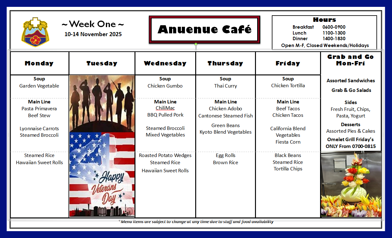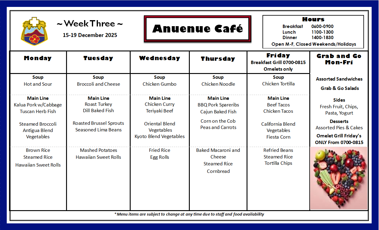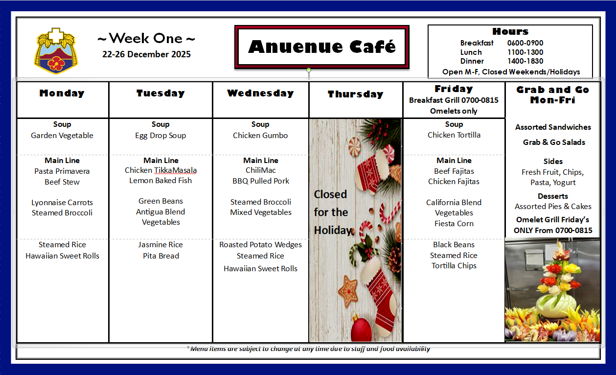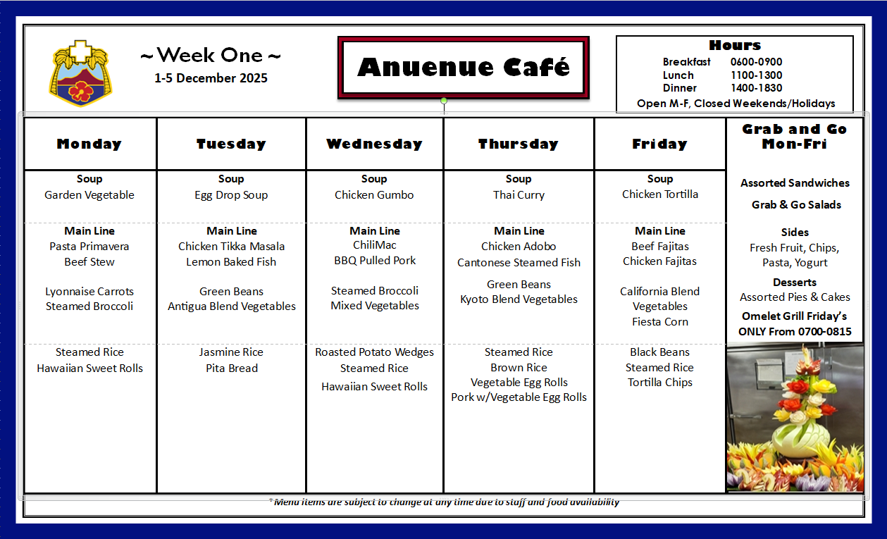 The Tripler Army Medical Center Dining Facility (Anuenue Cafe) is located on the first floor, B-Wing.