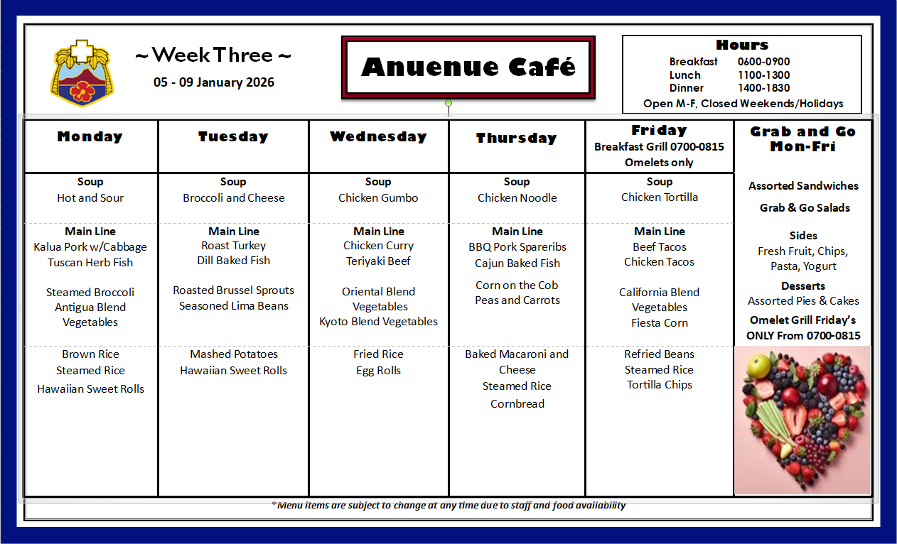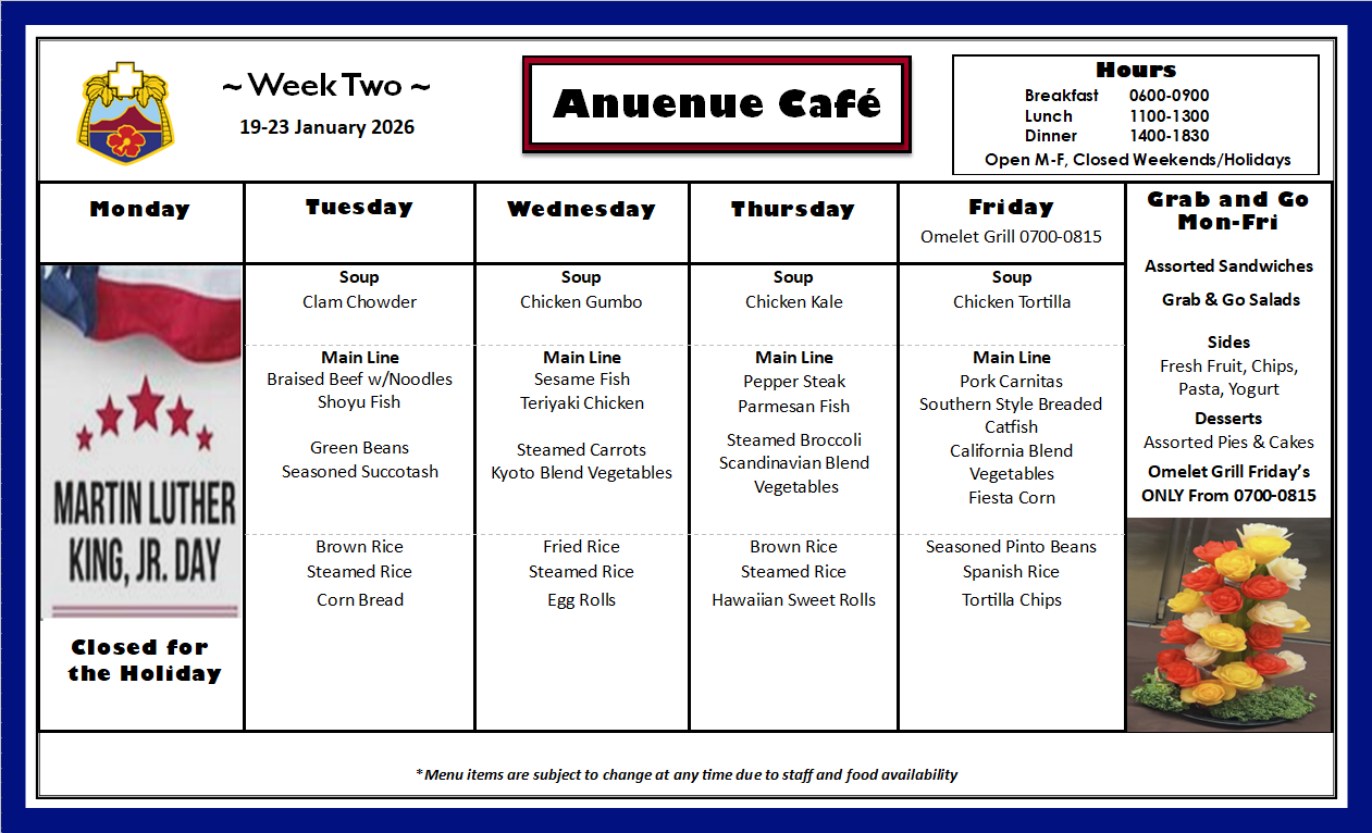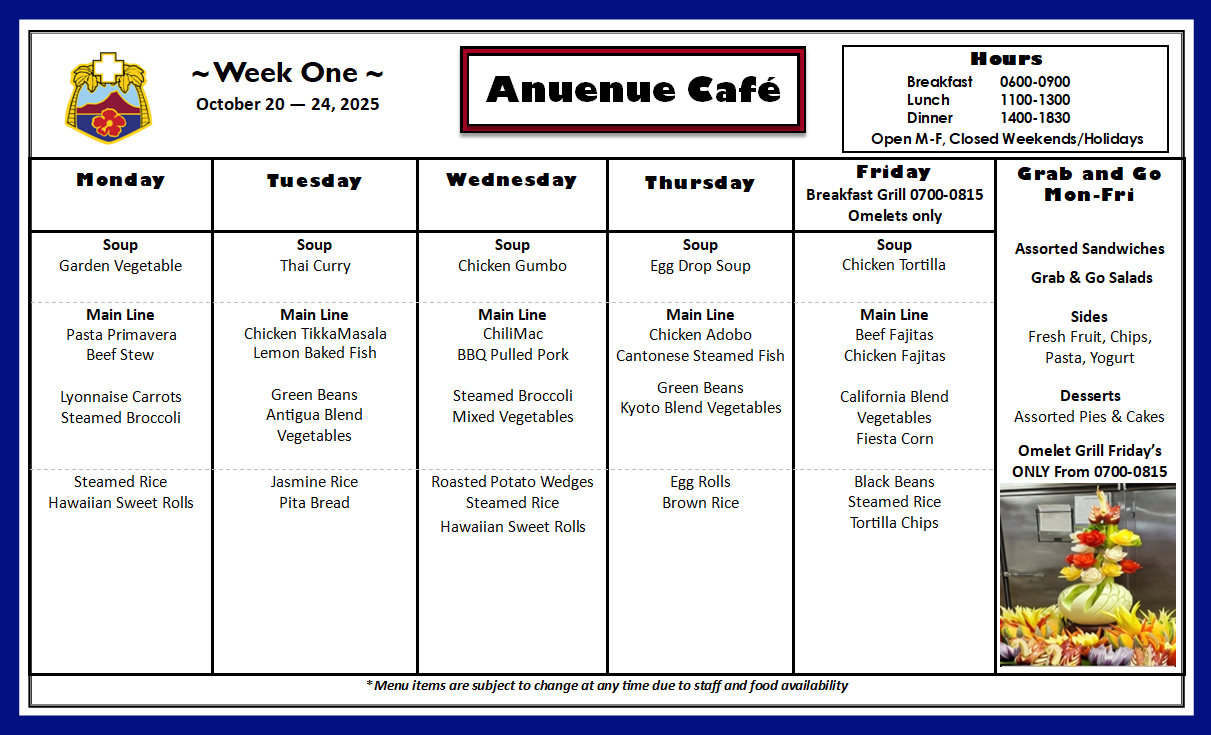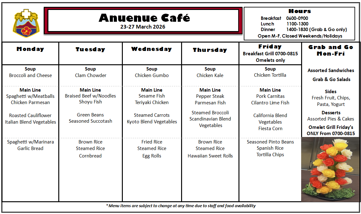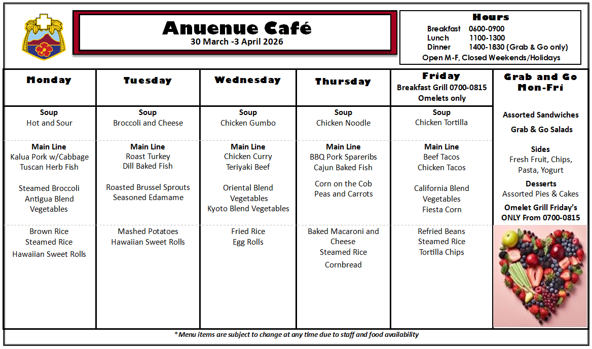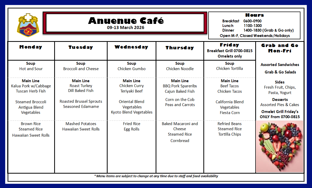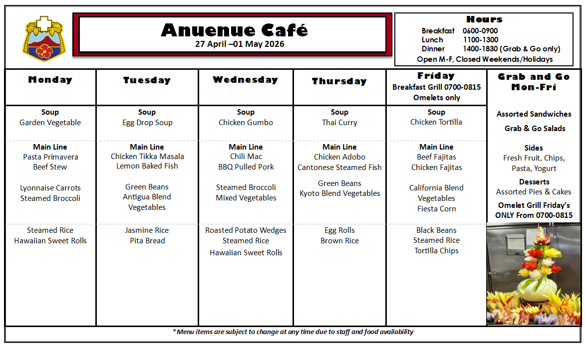 Q: What is on the menu for today? A: Please check our menu for our food options Anuenue Cafe Menu