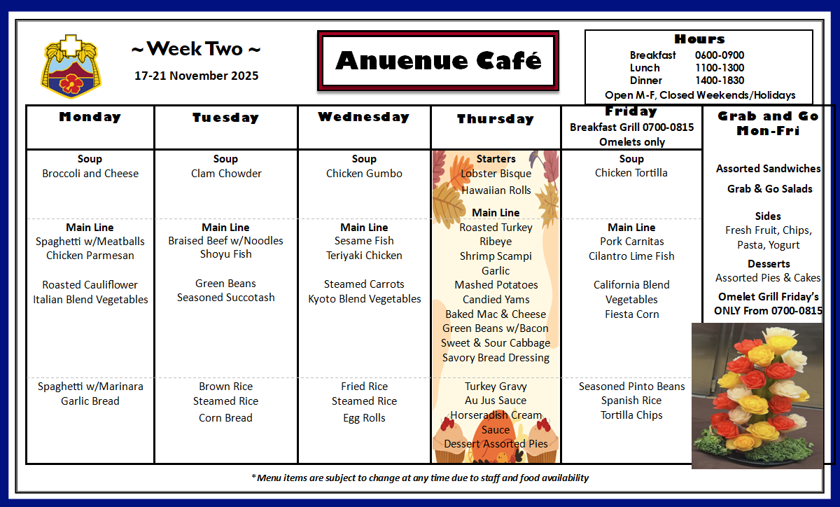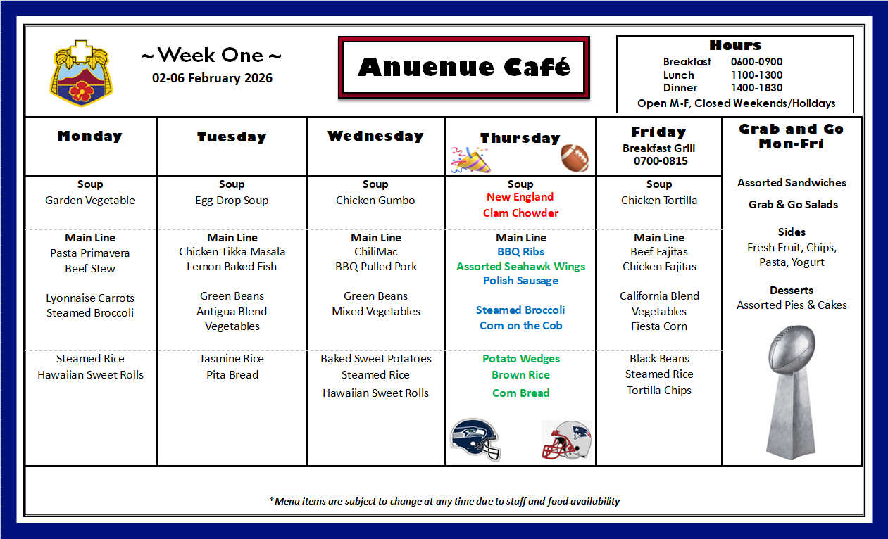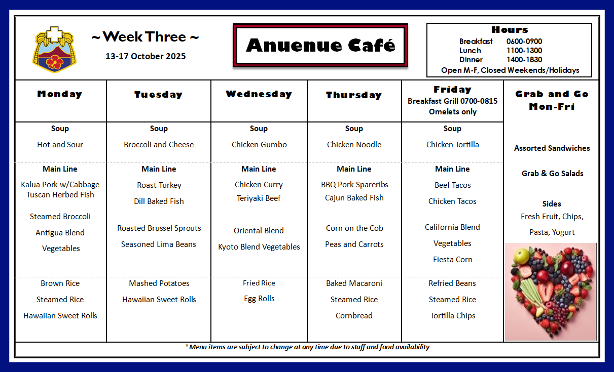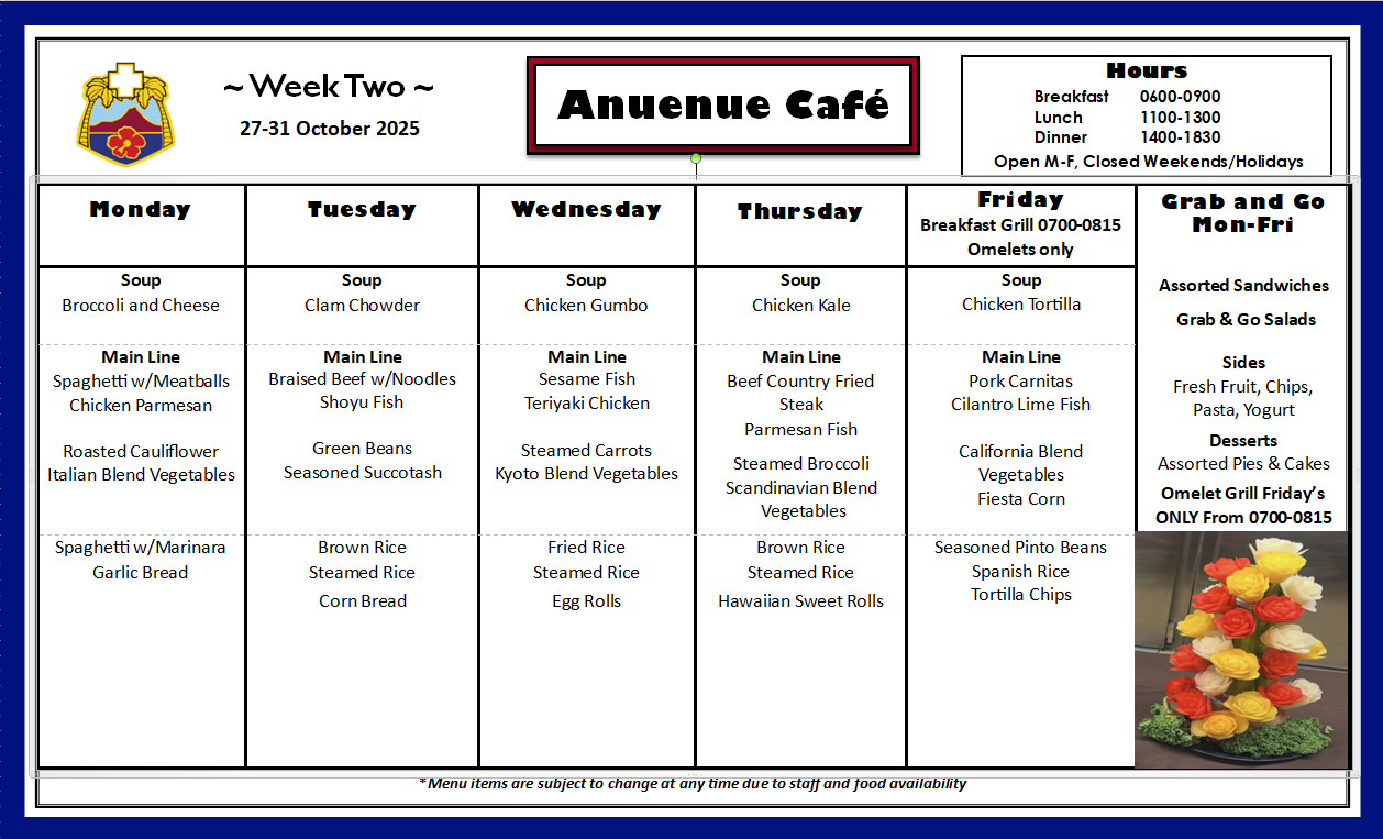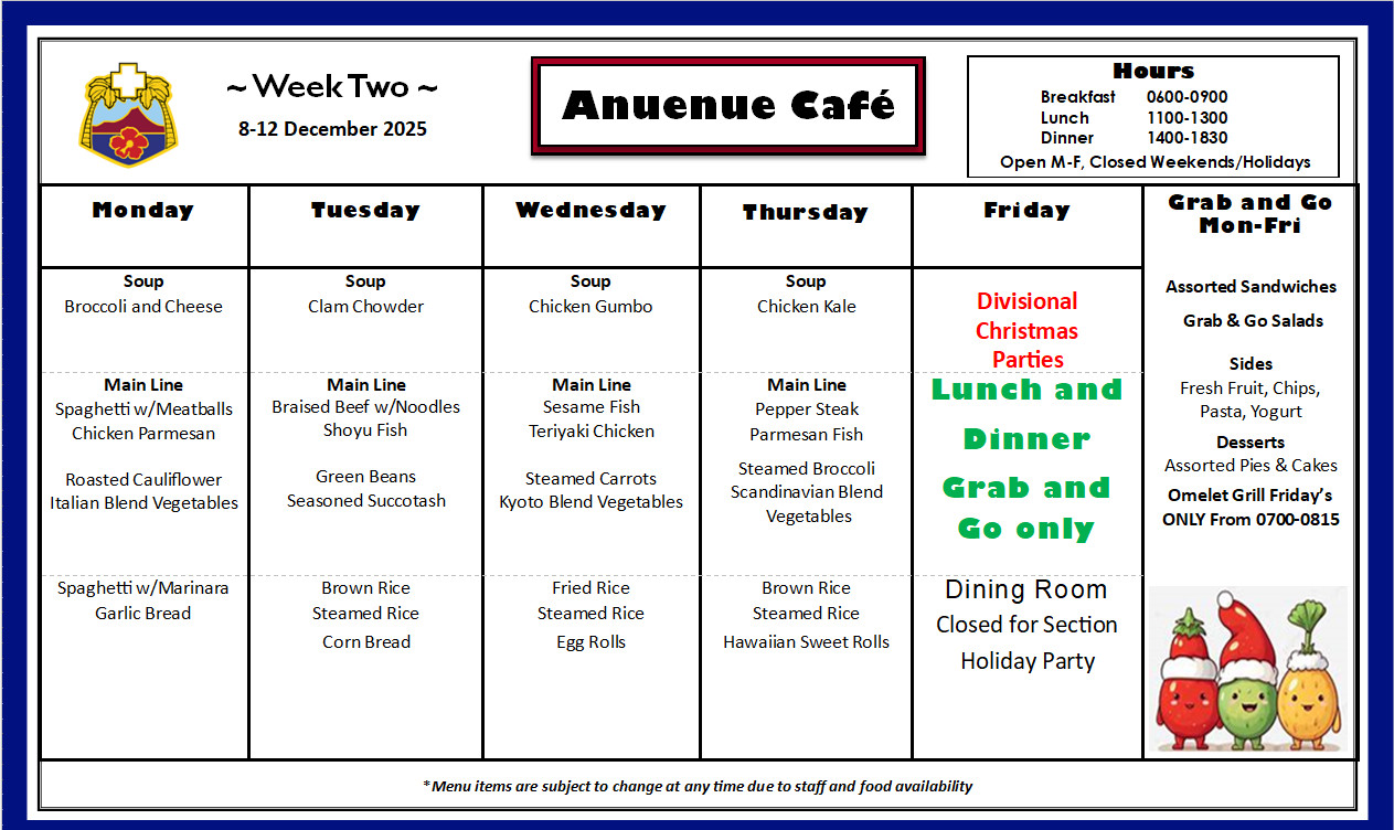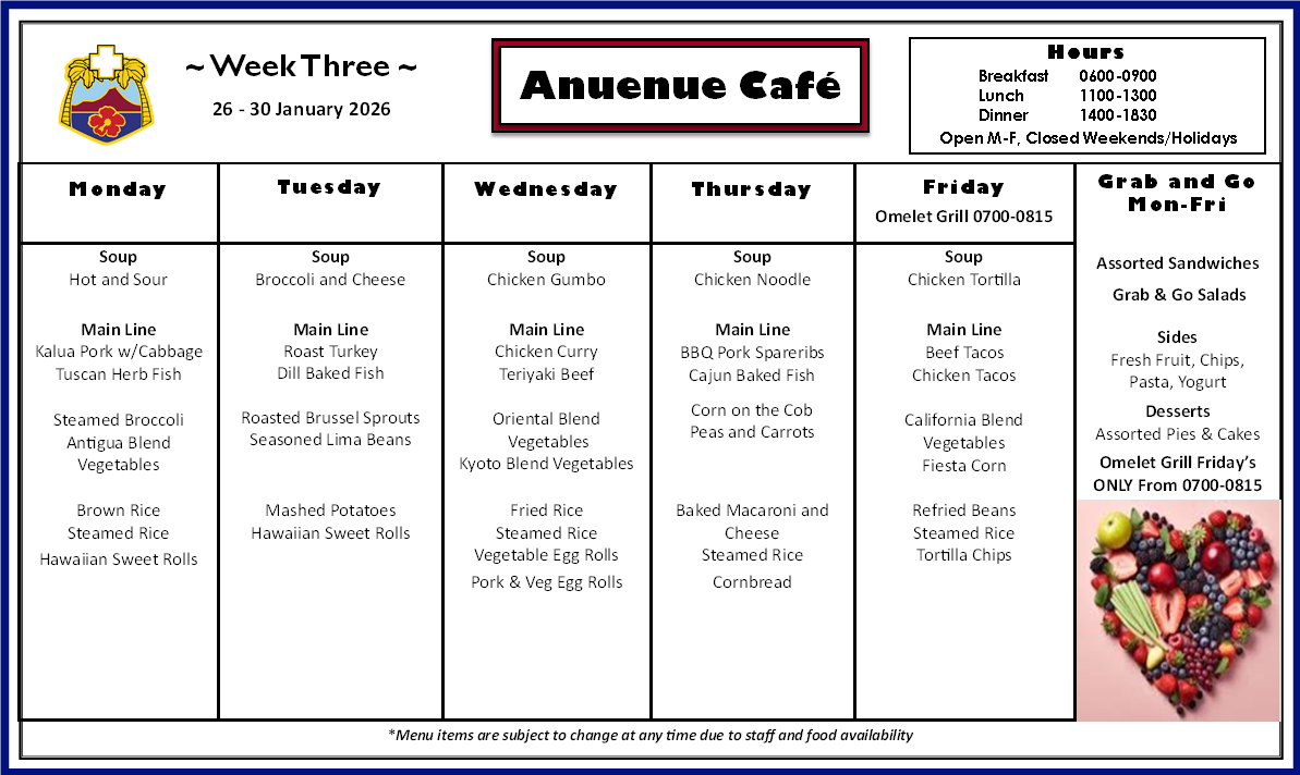 Q: What is on the menu for today? A: Please check our menu for our food options Anuenue Cafe Menu